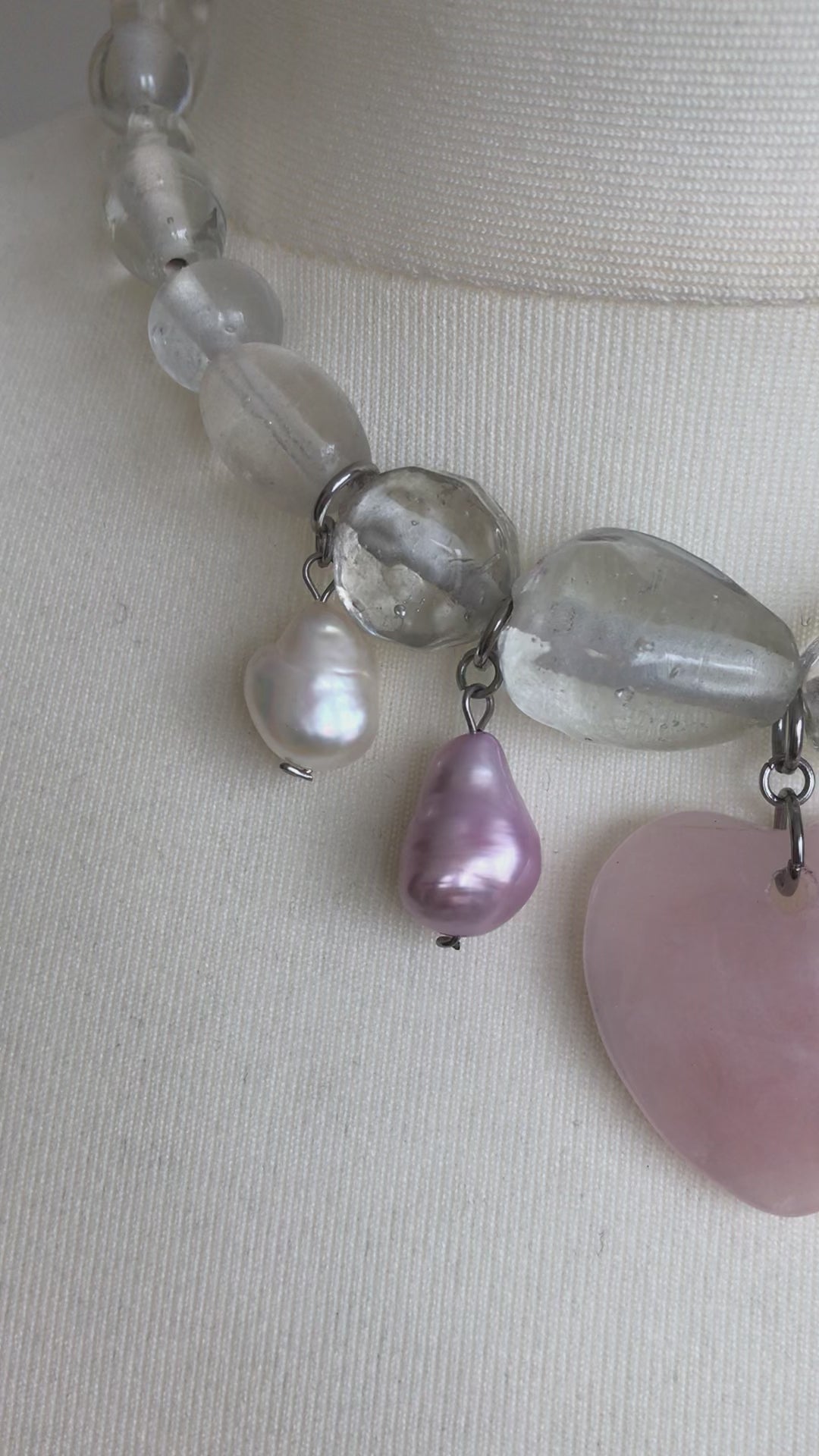 - materials: genuine pearls, rose quartz, glass, stainless steel