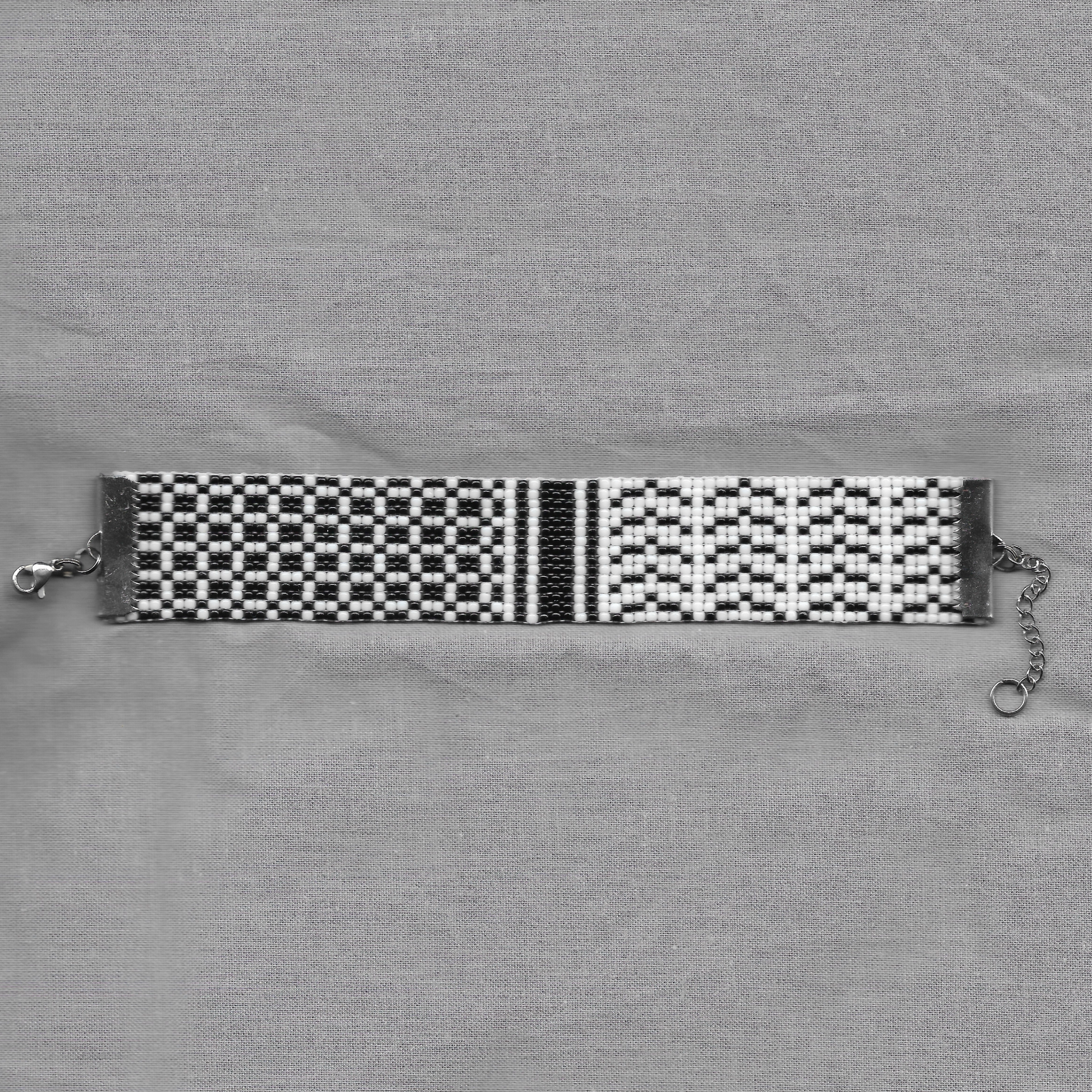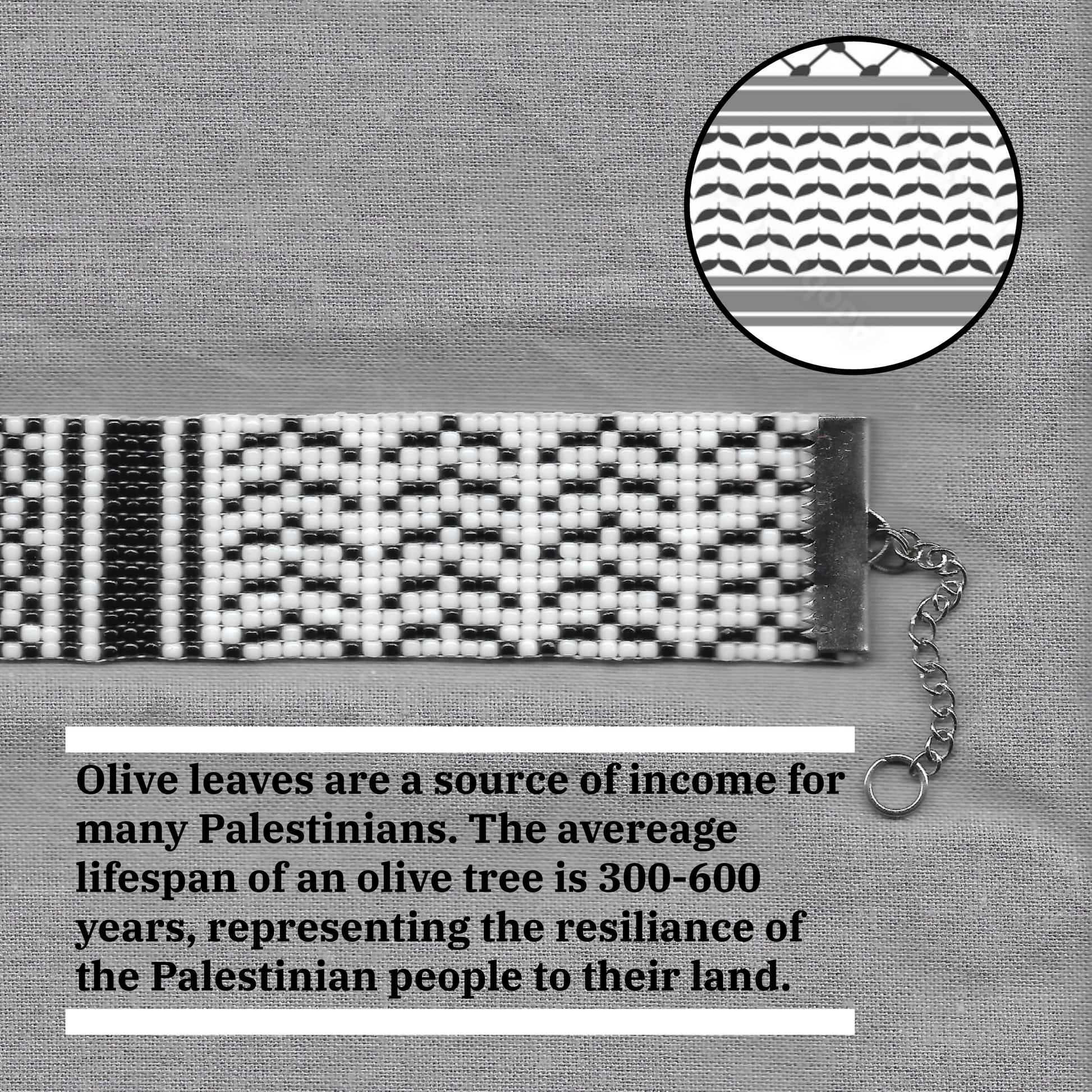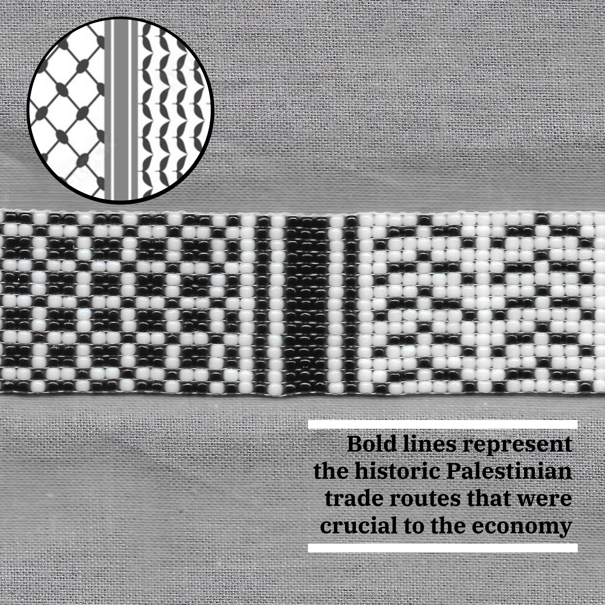 Originally woven into fabric, ours is woven with beads and we have incorporated the three key symbols: the fishnet, olive leaves and bold lines. All of which signify the abundance of the Palestinian land and sea*.