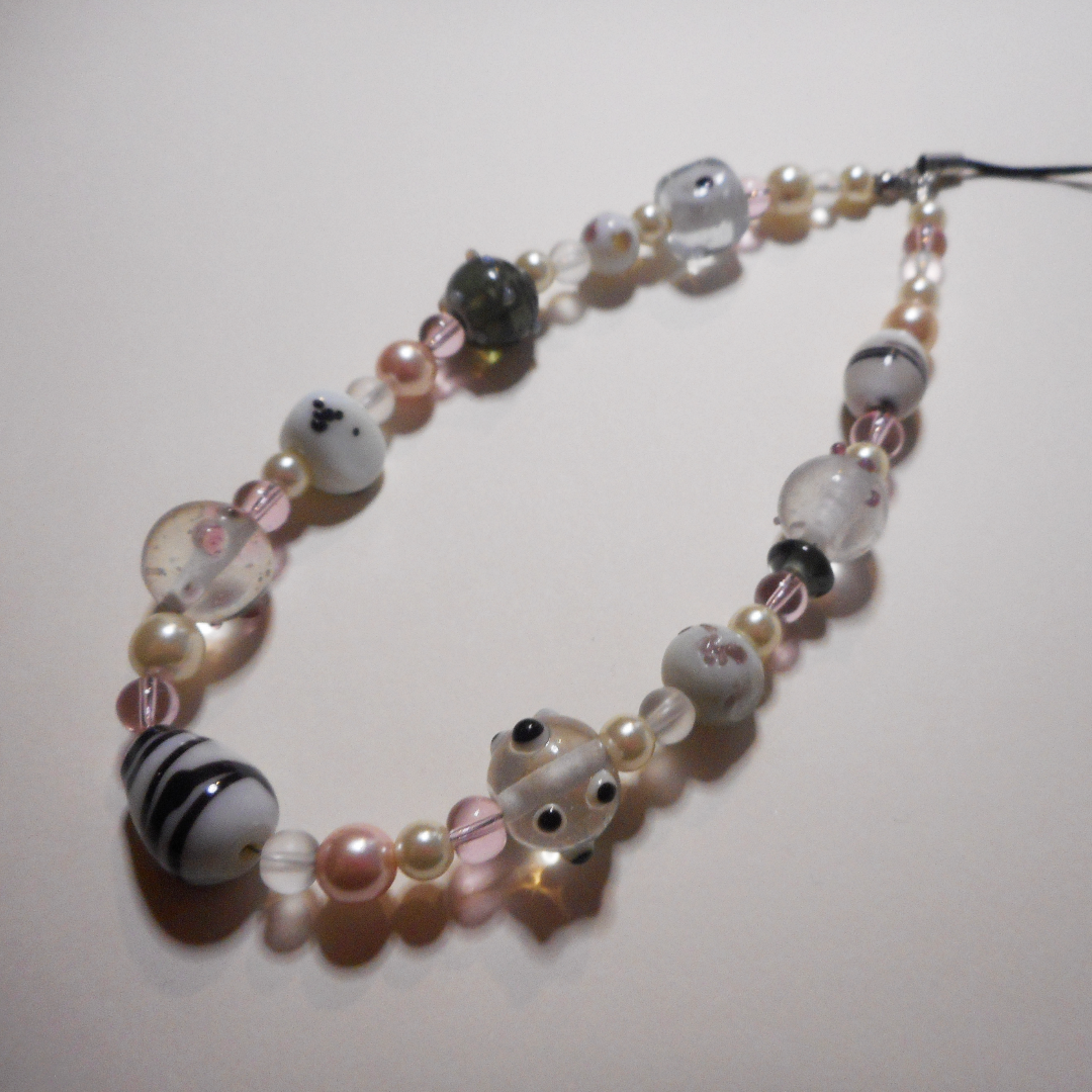 - materials: glass, agate, ceramic, up-cycled faux pearls, stainless steel